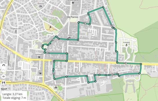 Zeelaan, Brouwerstraat, Verenigingstraat, Ollevierlaan, Barkenlaan, Marktlaan, W. Vandermeerenlaan, Keesjesdreef, Veurnestraat, Blauwe Distelweg, St.-Elisabethlaan, Eksterpad, Duinenstraat, Kruierstraat, St.-Elisabethlaan, Kerkepannestraat, Duinenstraat, Pastoor Dequidtstraat, Veurnestraat, Kasteelstraat, Poststraat, Zeelaan