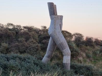Met zijn hoogte van bijna 7 meter staat hij aan de zeereep, alsof hij net uit zee komt wandelen. De torso van deze gigant is tot zetel getransformeerd en is een afspiegeling van de Christophorus figuur, gebaseerd op het legendarische verhaal van de reus die pelgrims over een wijde gevaarlijke rivier droeg. Hij is de grote grensoverschrijder in een veranderlijk overgangsgebied tussen land en water, tussen vast en vloeibaar. Christophorus past dus perfect bij de kustomgeving. Door de jaren heen kreeg het hout van de wadende reus een prachtige grijze patina.