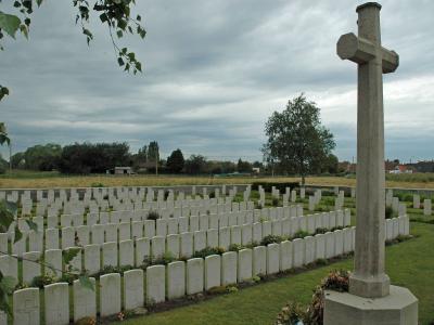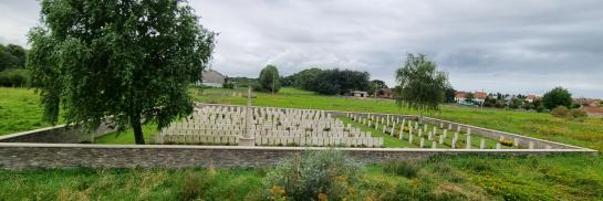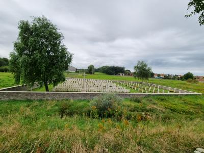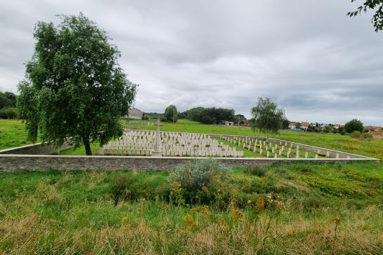 The cemetery covers an area of 1,144 m² and is enclosed by a low wall. British cemeteries, however small, are characterised by the same basic concept that was already established in early 1918. One of the views on the design is that such a cemetery is not a churchyard or a municipal cemetery, but a monument. So it is not only laid out as recognition, but even more as veneration. All the tombstones bear the same chiselled information. There is no distinction in rank and everyone has the same headstone: white Portland stone from chalk quarries in the south of England.