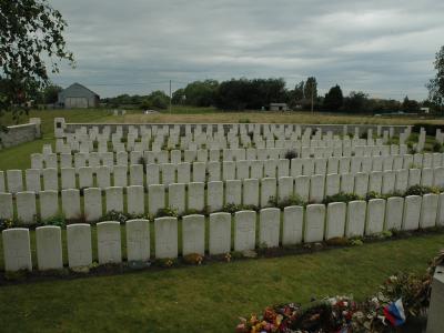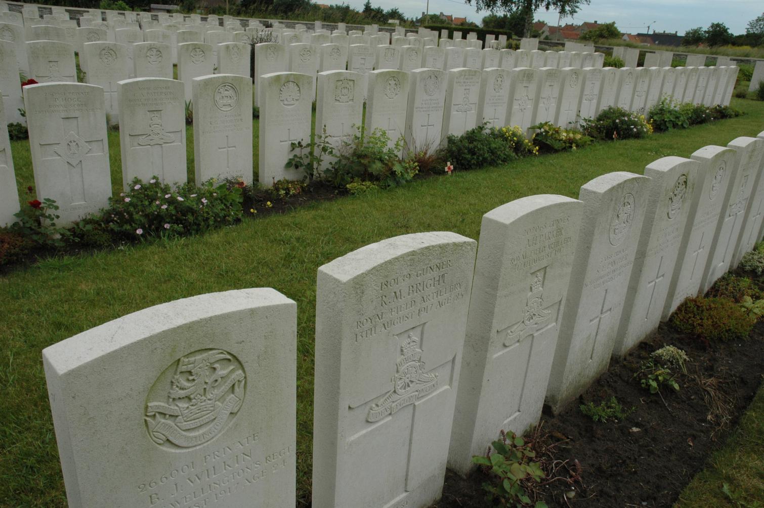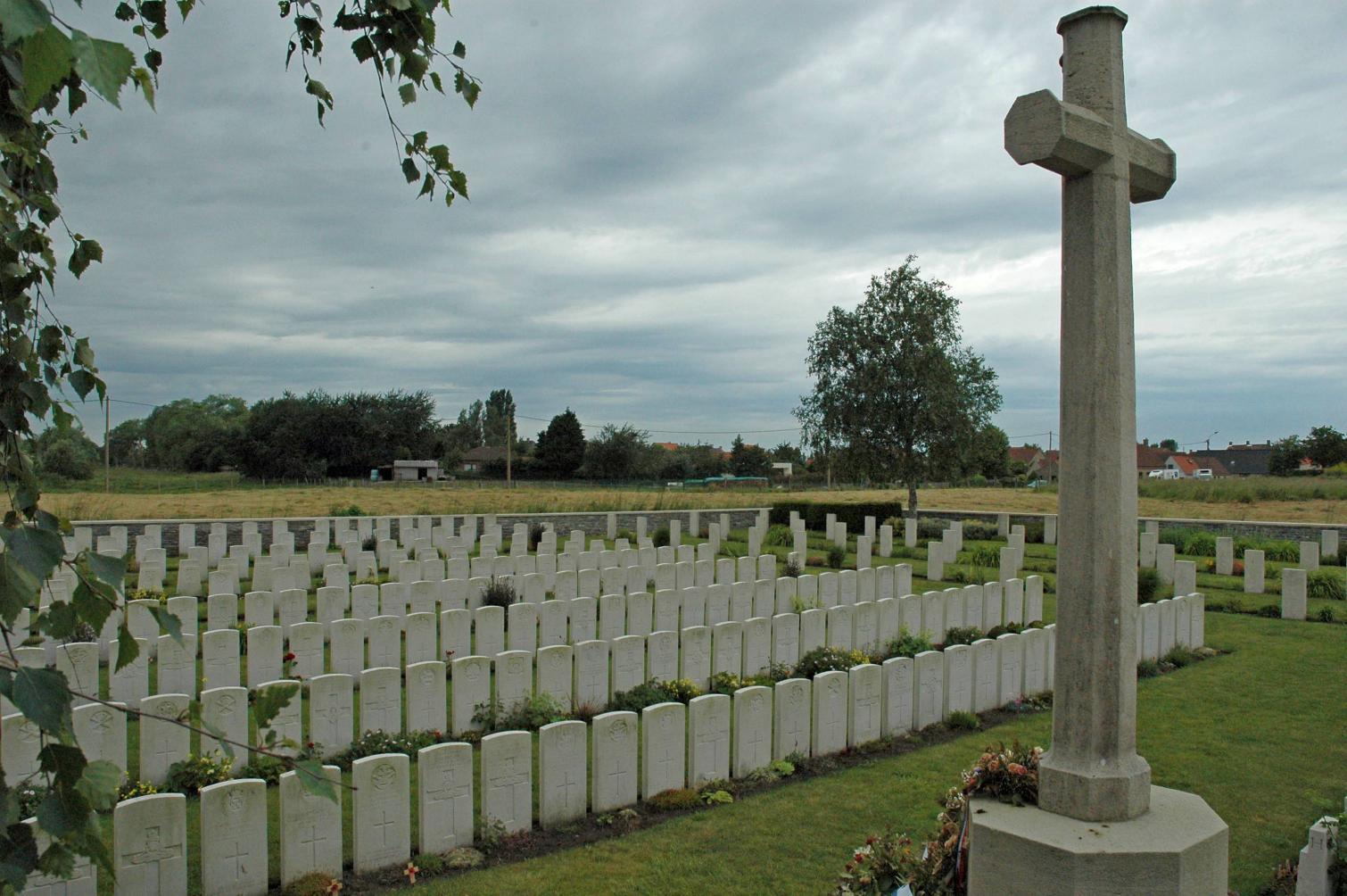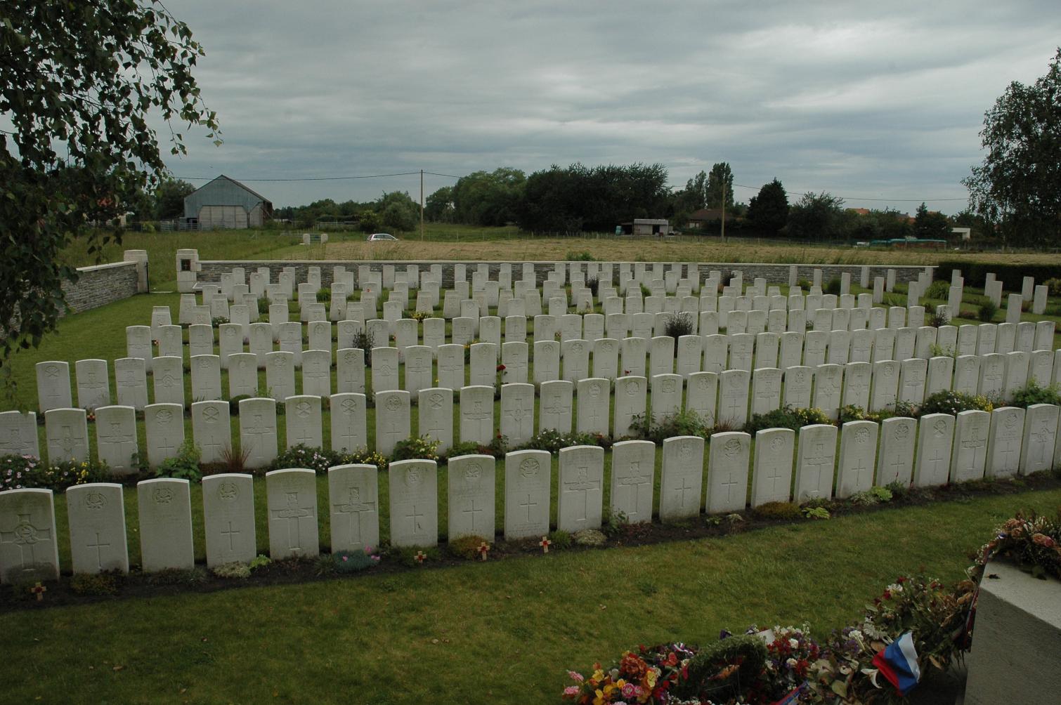 British cemeteries look colourful, just like the parks in England. They are not gloomy cemeteries at all; they are bright and hopeful, open to the sky. All 156 British cemeteries in West Flanders are managed by the Commonwealth War Graves Commission in Ieper. The site is actually British soil, ceded by Belgium.