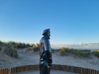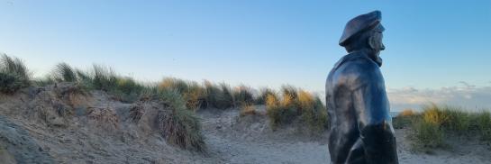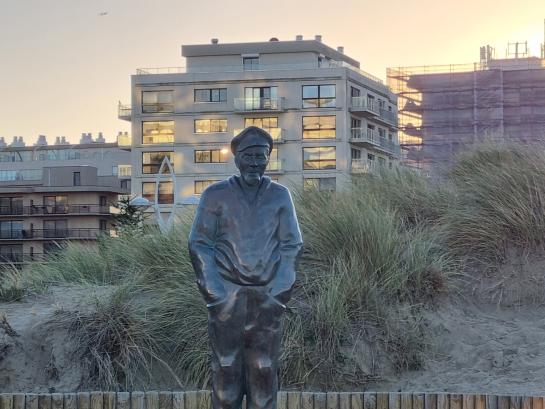 Au bord de la plage, Pier Kloeffe (Petrus Decreton) scrute l’horizon en habits de pêcheur au milieu des dunes. La statue en bronze est devenue la figure de proue de la pêche à De Panne.