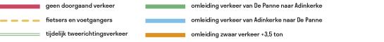 De Kerkstraat wordt onderbroken aan het kruispunt met de Adinkerkelaan. Het deel van de Kerkstraat tussen de Westhoeklaan en de Veurnestraat wordt dan tijdelijk tweerichtingsverkeer. Zo blijft de supermarkt bereikbaar voor wie met de wagen boodschappen doet. (dubbele groene lijn op de kaart)