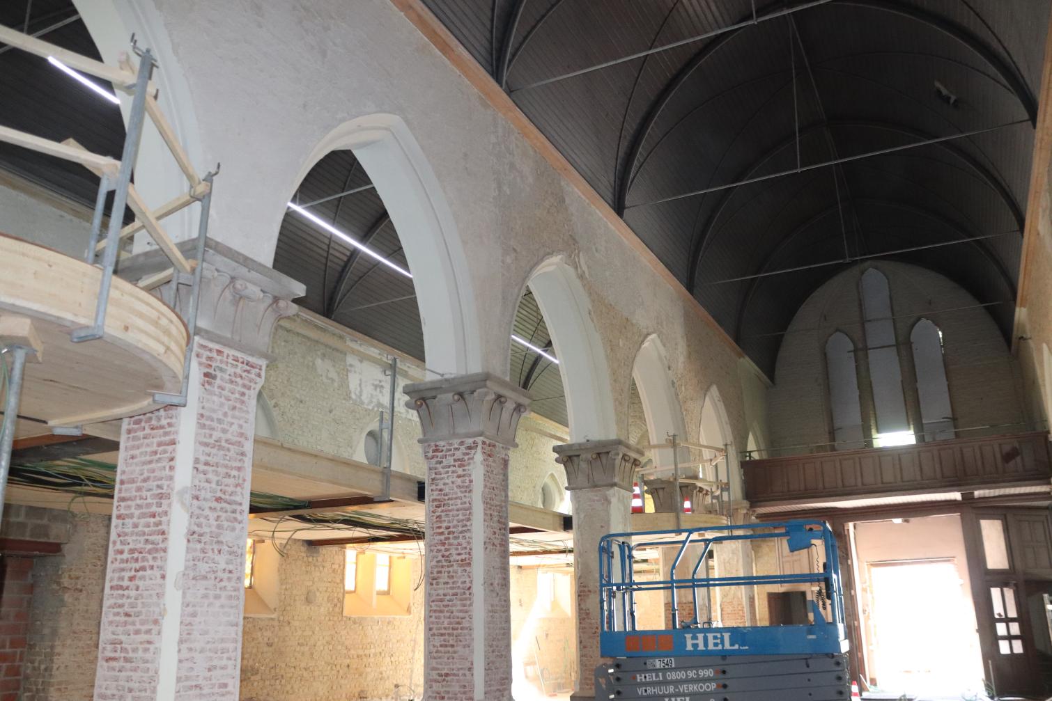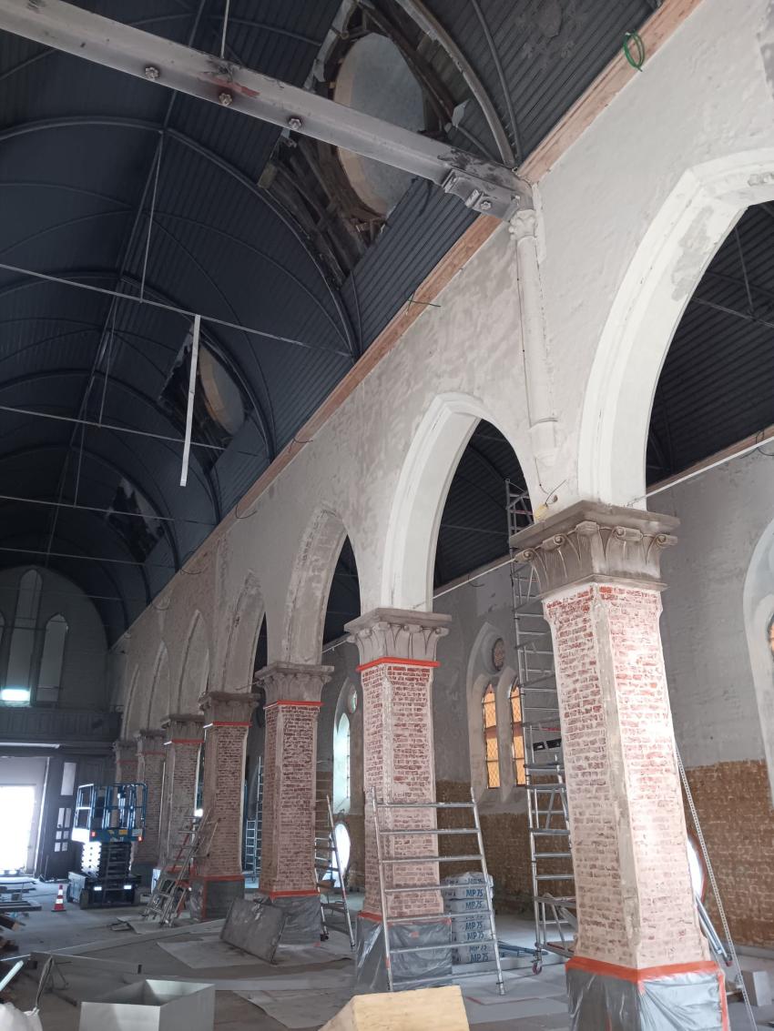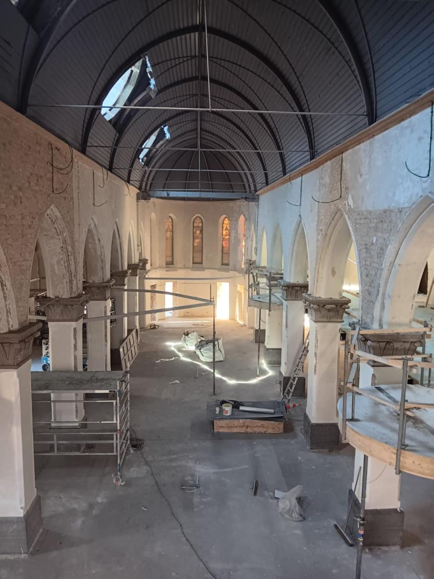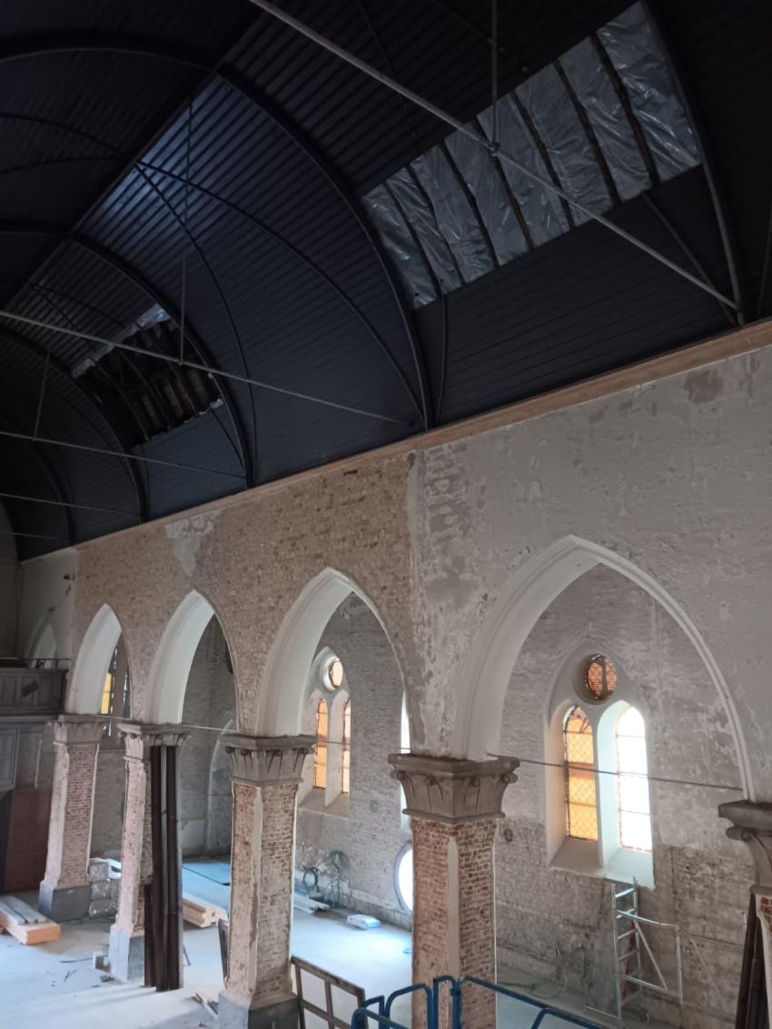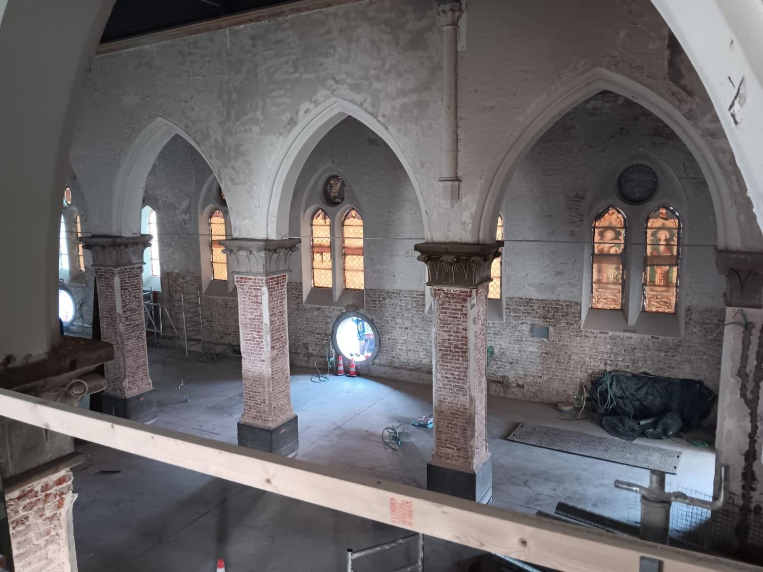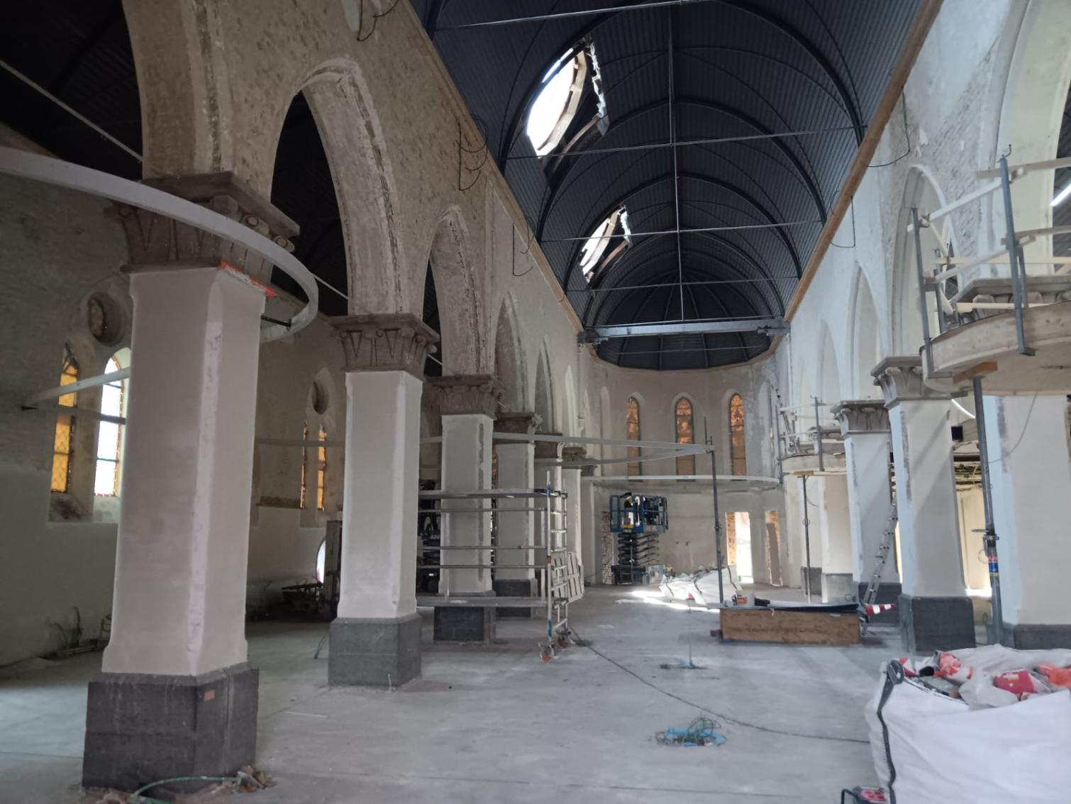 - Binnenin zijn de vlakke pleisterwerken in de kerk afgerond. De akoestische pleisterwerken op grotere hoogte volgen na nieuwjaar.