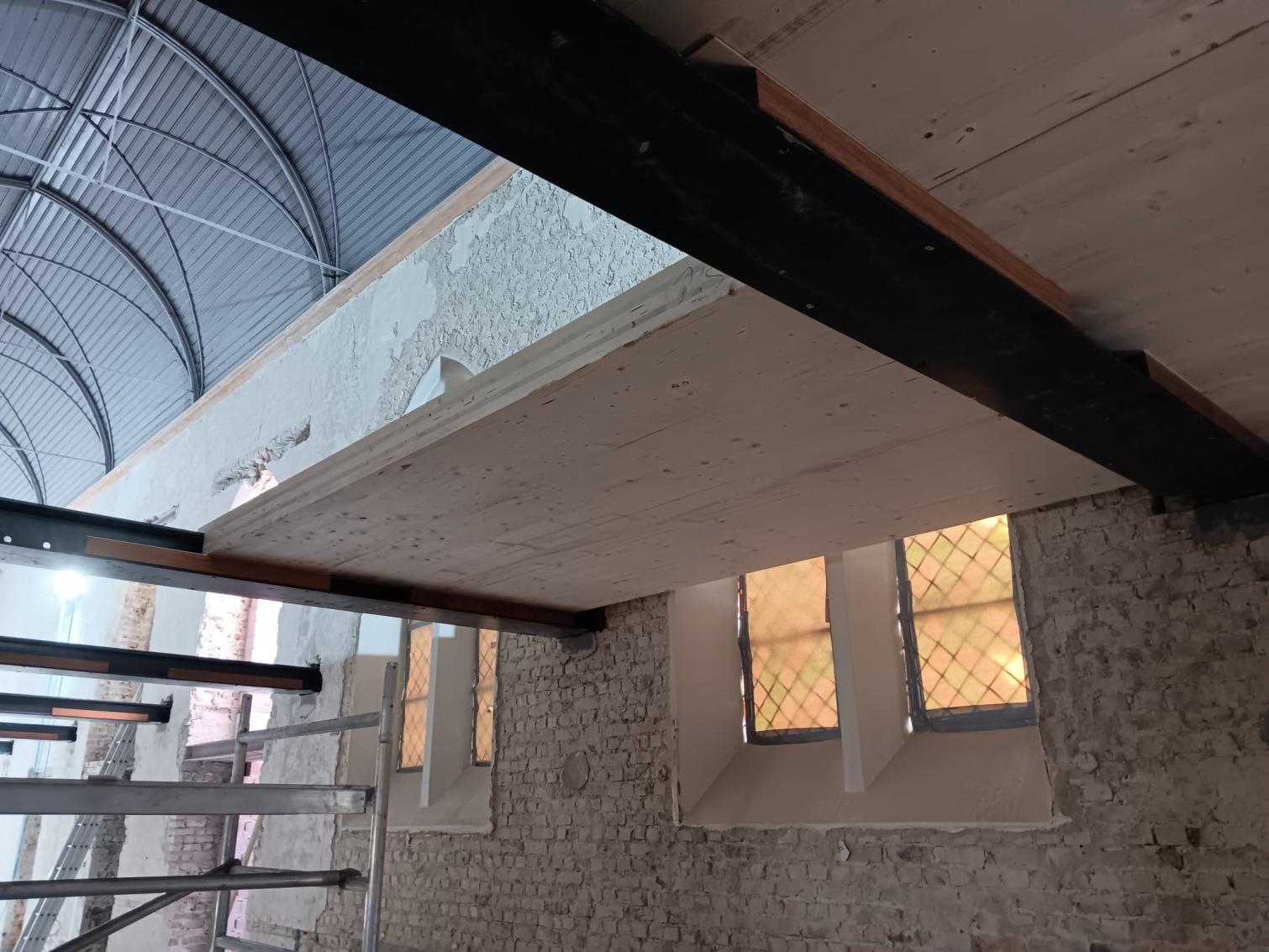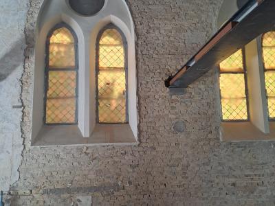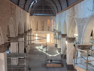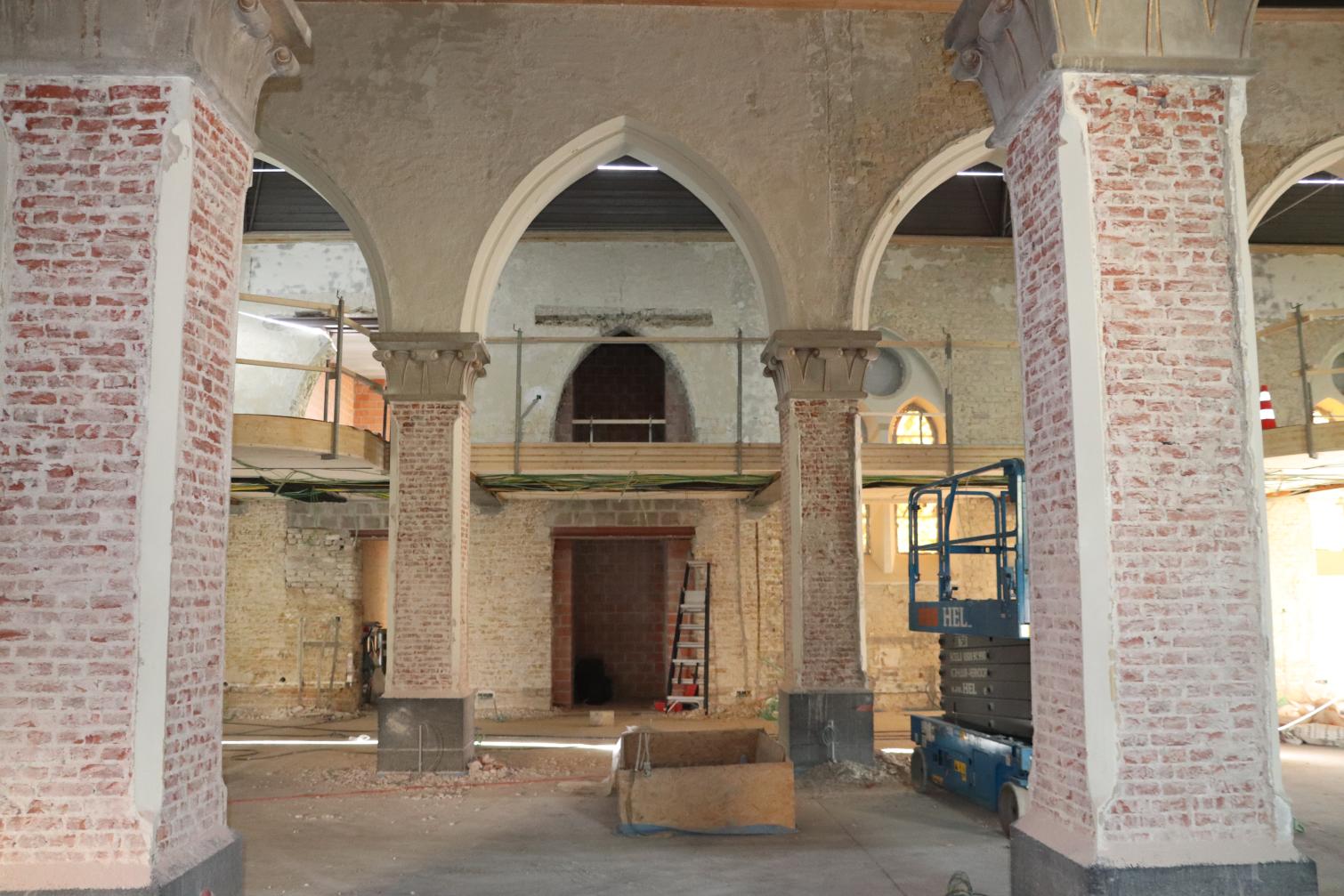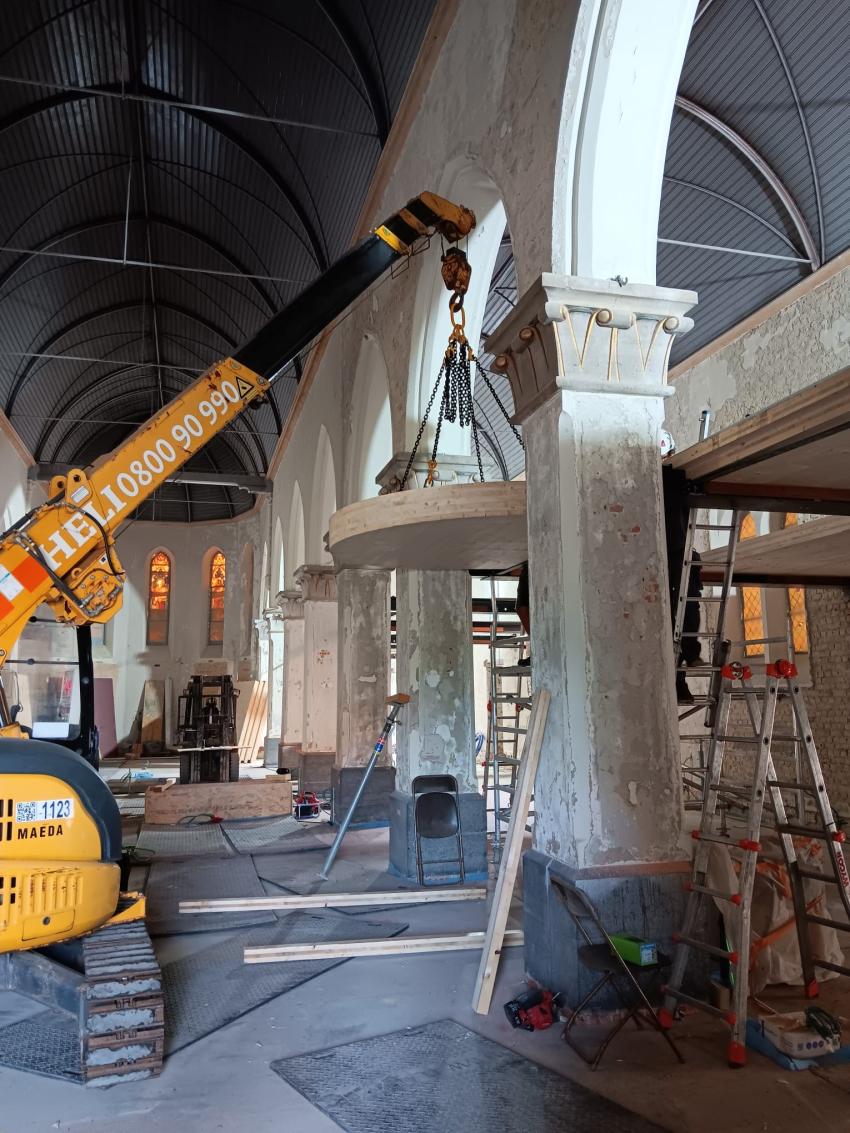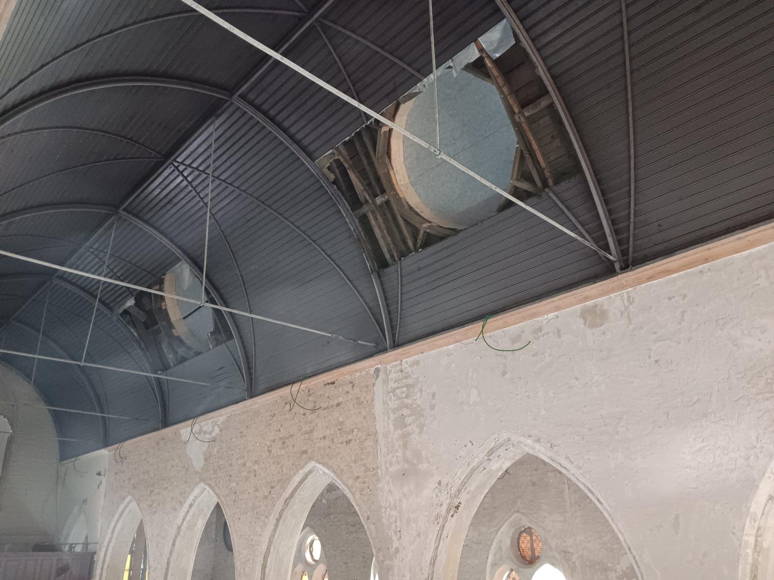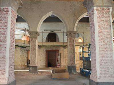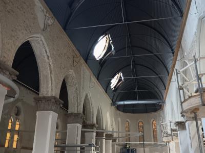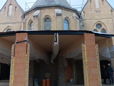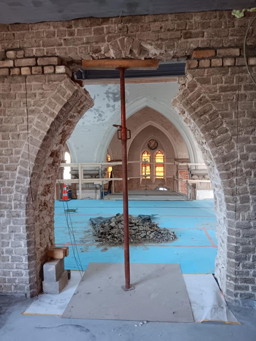 - Binnenin zijn de vlakke pleisterwerken in de kerk afgerond. De akoestische pleisterwerken op grotere hoogte volgen na nieuwjaar.