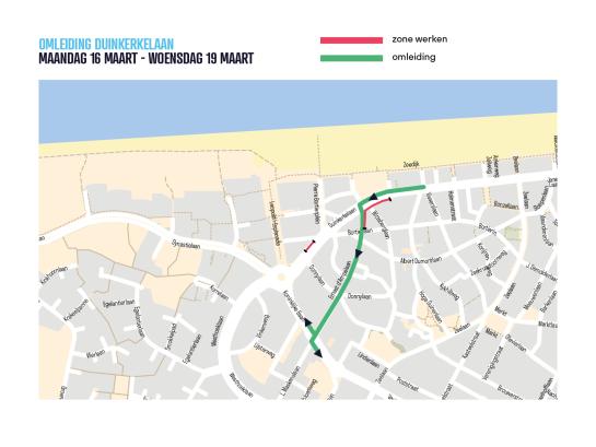 - Verkeer vanuit Adinkerke rijdt om via Adinkerkelaan → Sint-Elisabethlaan → Wielewaalstraat → Veurnestraat.